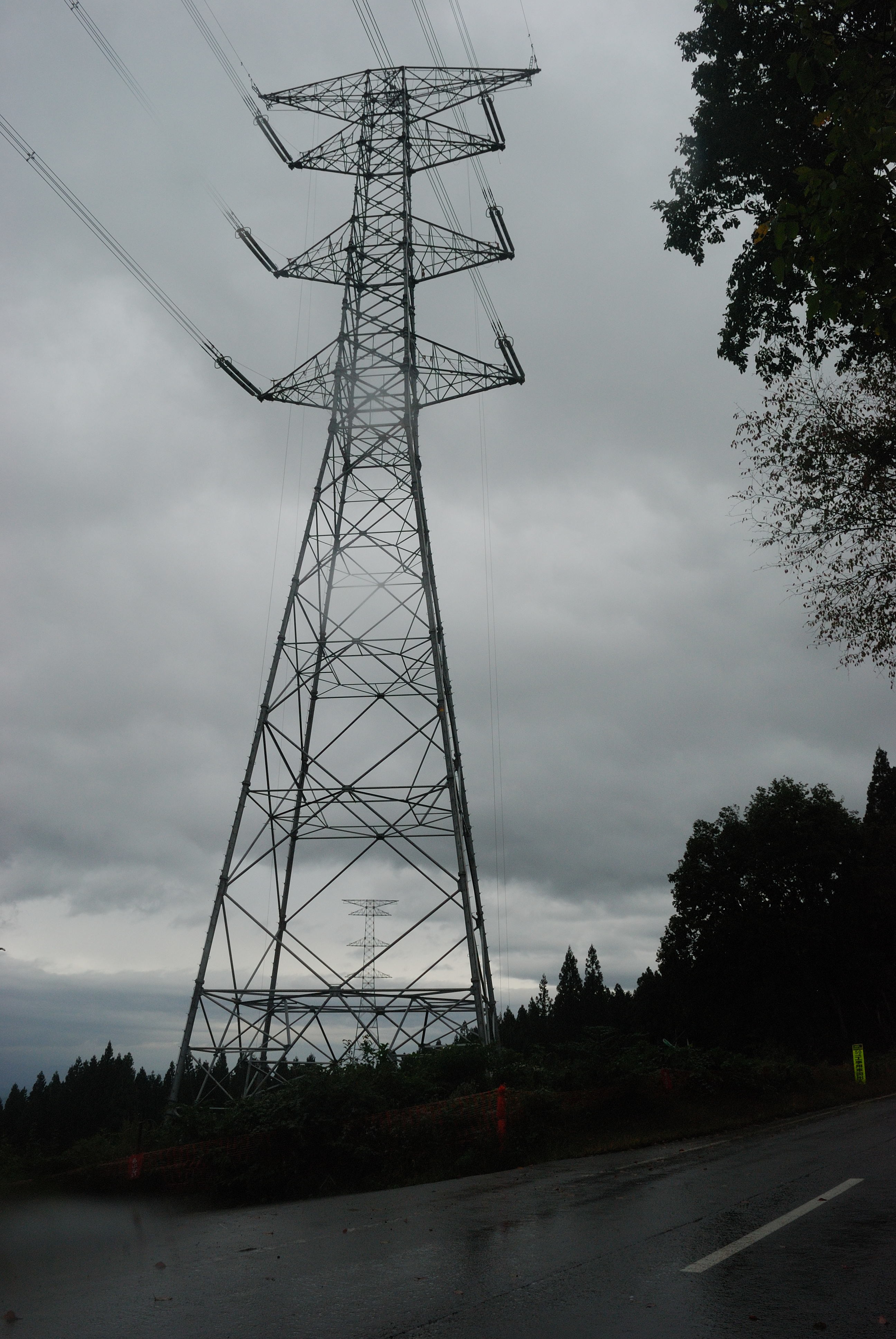 福島幹線は比較的初期の500 kV送電線で、鉄塔が等辺山形鋼でできています。そのためシルエットも今風の鉄塔よりもずんぐりしていて、愛嬌を感じさせます。その一方、引き留め鉄塔は十字の鋼材が使われているため、より力強い印象を受けます。そんなところが魅力的だと感じます。