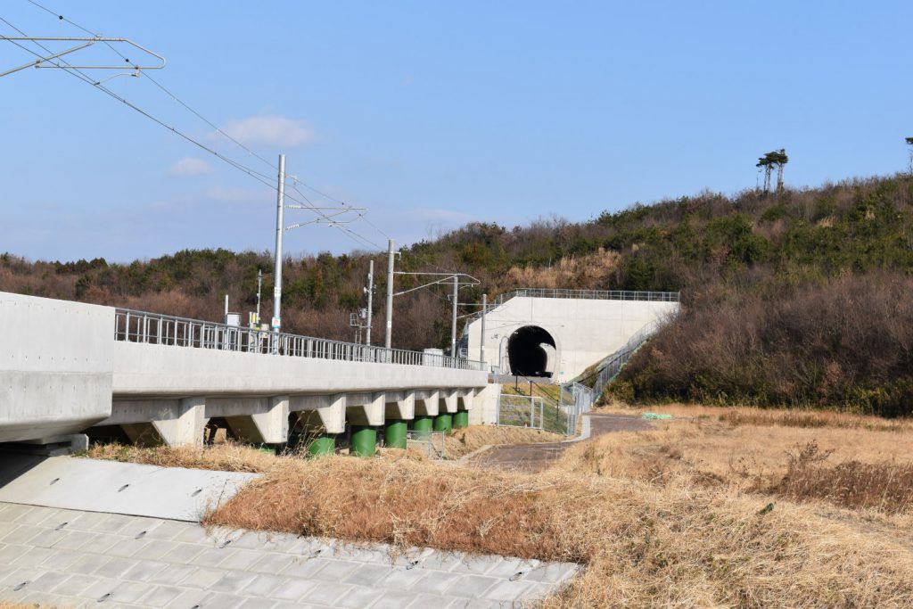 山下駅を出た列車は、わずかに海側へ寄りつつ再び地上に降ります。少し突き出した台地の縁をすすんだああとは、進路を山側に向けて今回の工事で新設された2つのトンネル、第1戸花山トンネルと第2戸花山トンネルをくぐります。この記事では、北側にある第2トンネルから紹介していきます。